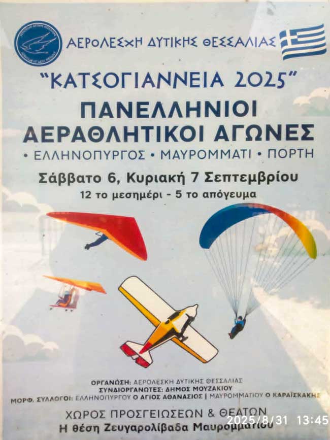 Ο Δήμος Μουζακίου, σε συνεργασία με την Αερολέσχη Δυτικής Θεσσαλίας, τον Πολιτιστικό Σύλλογο Μαυρομματίου «Ο Καραϊσκάκης» και τον Πολιτιστικό Σύλλογο Ελληνοπύργου «Άγιος Αθανάσιος», διοργανώνουν για πρώτη φορά τους Πανελλήνιους Αεραθλητικούς Αγώνες “ΚΑΤΣΟΓΙΑΝΝΕΙΑ 2025”, προς τιμήν του πρωτοπόρου ανεμοπτεριστή Κωνσταντίνου Κατσόγιαννου.