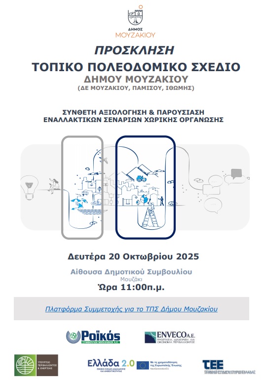 Ο Δήμος Μουζακίου, στο πλαίσιο της εκπόνησης της μελέτης «ΤΟΠΙΚΟ ΠΟΛΕΟΔΟΜΙΚΟ ΣΧΕΔΙΟ ΔΗΜΟΥ ΜΟΥΖΑΚΙΟΥ (ΔΕ ΜΟΥΖΑΚΙΟΥ, ΠΑΜΙΣΟΥ, ΙΘΩΜΗΣ)» διοργανώνει ανοιχτή εκδήλωση για την παρουσίαση των εναλλακτικών σεναρίων χωρικής οργάνωσης του Δήμου.