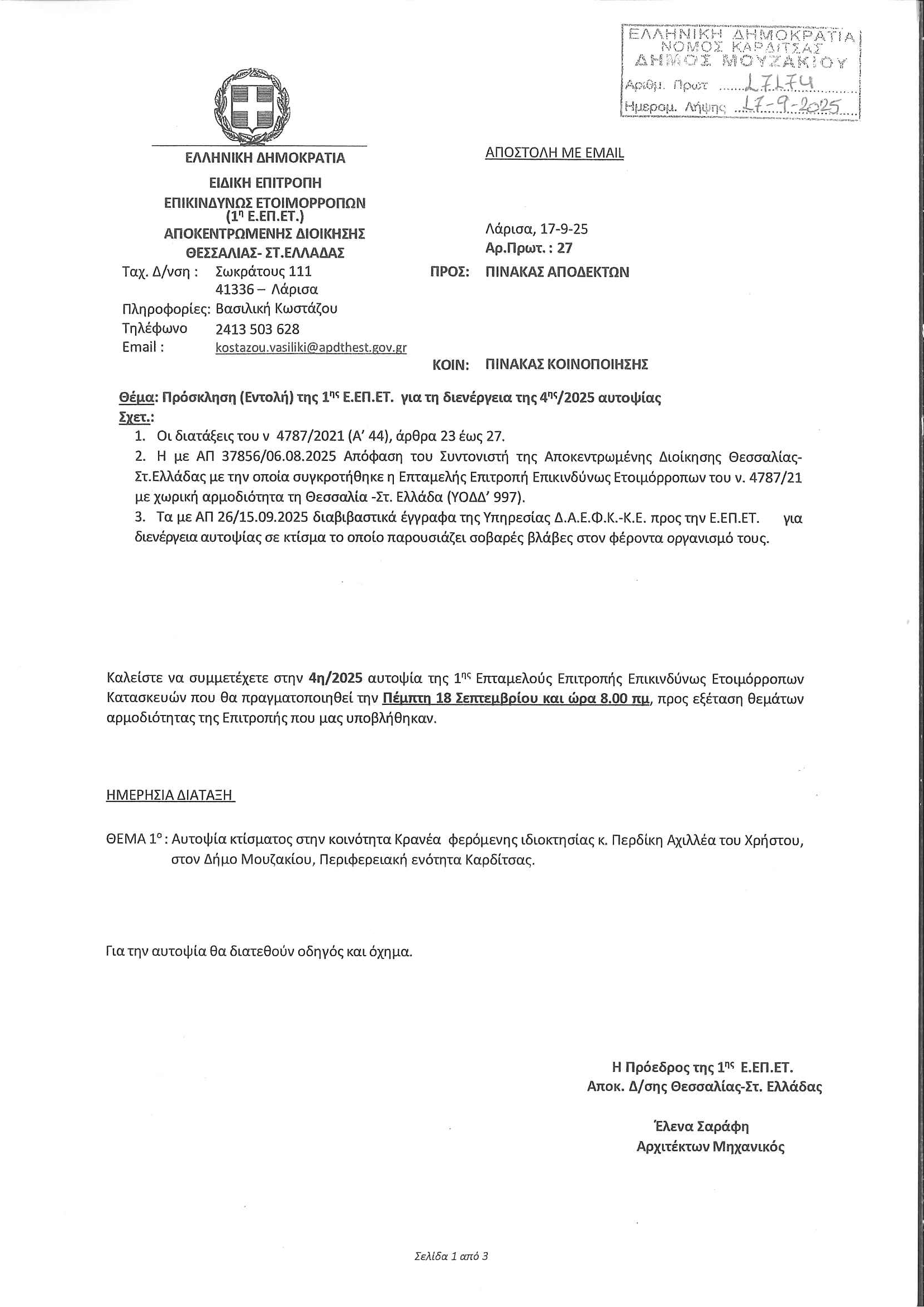 Πρόσκληση (Εντολή) της 1ης Ε.ΕΠ.ΕΤ. για την διενέργεια της 4ης/2025 αυτοψίας για επικίνδυνο κτίριο